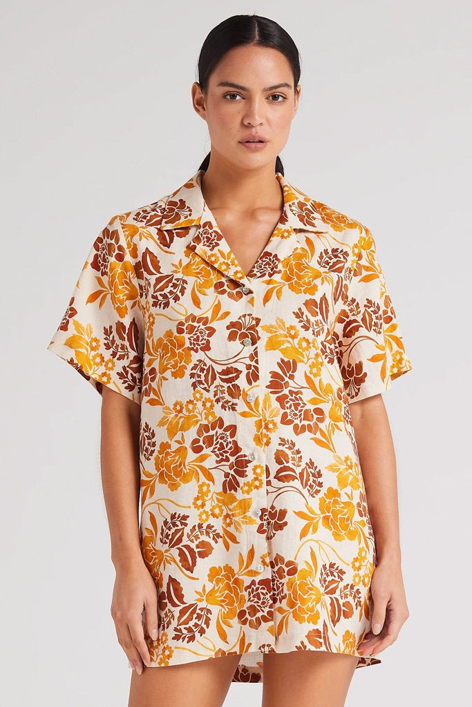 The most perfect beach to bar dress in our Aruba print! Our Shirt Dress silhouette is equals part casual and elevated. Crafted in 100% Linen, you'll be living in this style from sunrise to sunset, all summer long.